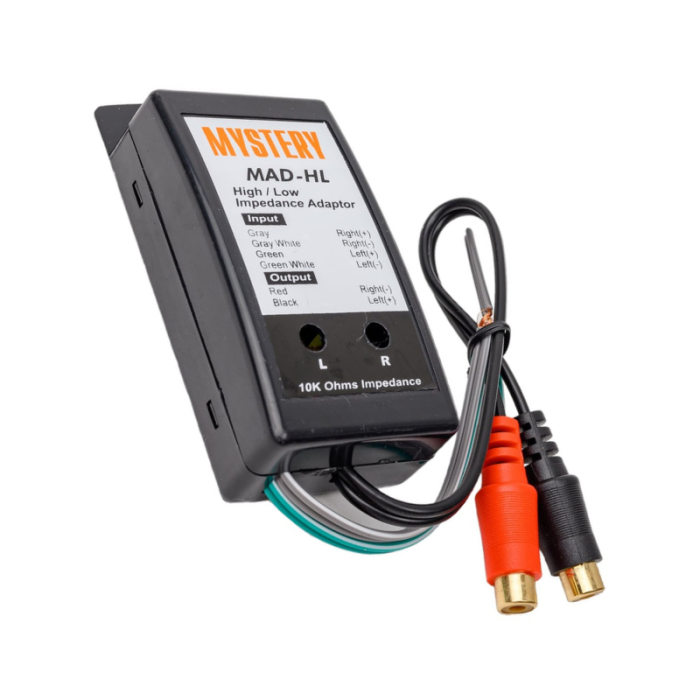 Mystery MAD-HL — це автомобільний конвертор рівня сигналу, який дозволяє підключати підсилювач до головних пристроїв, що не мають лінійних виходів. Завдяки цьому пристрою можливо перетворювати високий рівень сигналу (від динаміків) у низький, сумісний із RCA-входами підсилювачів.Він застосовується у випадках, коли штатна магнітола не має спеціальних лінійних виходів, що є поширеною проблемою в багатьох автомобілях. Це зручний і доступний спосіб інтеграції підсилювача в аудіосистему автомобіля без необхідності заміни головного пристрою.