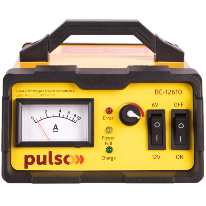 Pulso BC-12610 — це імпульсний зарядний пристрій для акумуляторів ємністю від 5 до 120 А/год. Пристрій працює з акумуляторами типу SLA (свинцево-кислотні), GEL і AGM, підтримує напругу акумуляторів 6 В та 12 В. Зарядний струм регулюється від 0 до 10 А. На передній панелі розміщений стрілочний амперметр та світлодіодні індикатори для контролю процесу заряджання. Пристрій оснащений захистом від короткого замикання, зворотної полярності та перевантажень, що підвищує його надійність та безпеку у використанні. Модель має зручну ручку для перенесення та металевий корпус.